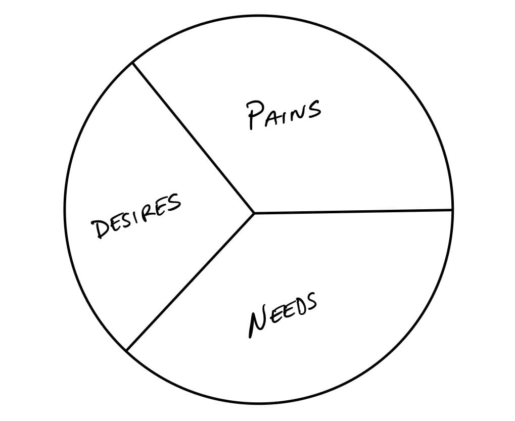 You should know about these because most creators understand their audience at a much deeper level than, say, a tech company. Draw a big circle on a whiteboard or a sheet of paper, and split it into three sections, labeled Pains, Desires, and Needs, like this: